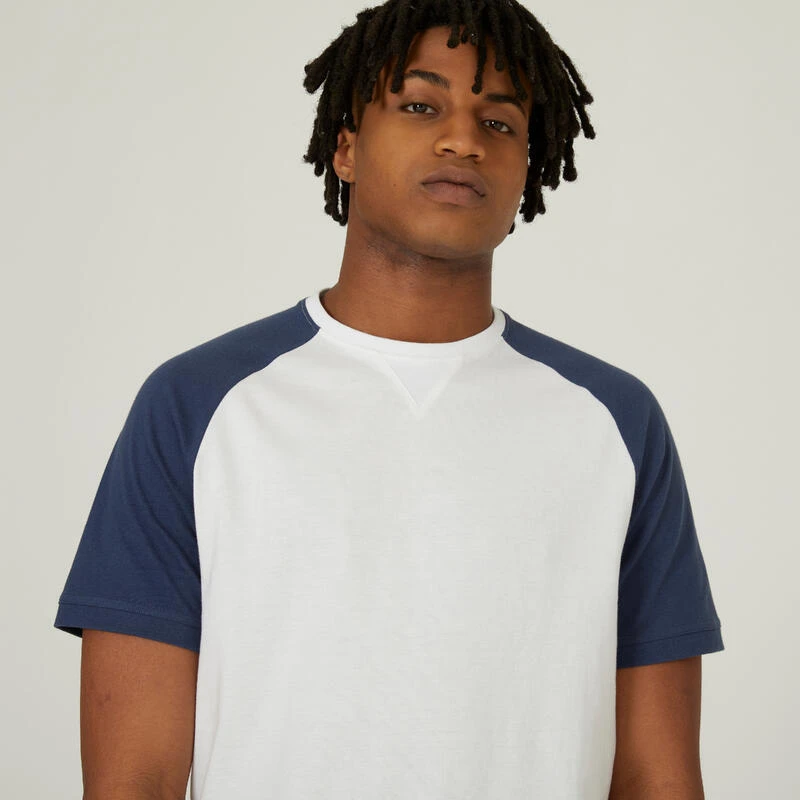 Compra en Decathlon Camiseta fitness manga corta cuello redondo algodón Hombre 520 blanco y Con su corte recto, su cuello redondo y su gramaje de 190 g/m² con una caída perfecta sobre tu silueta, esta camiseta bicolor 100 % algodón asegura un look moderno.