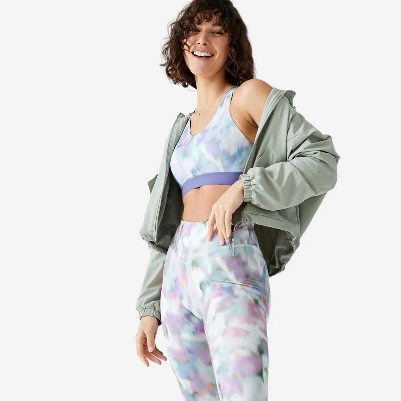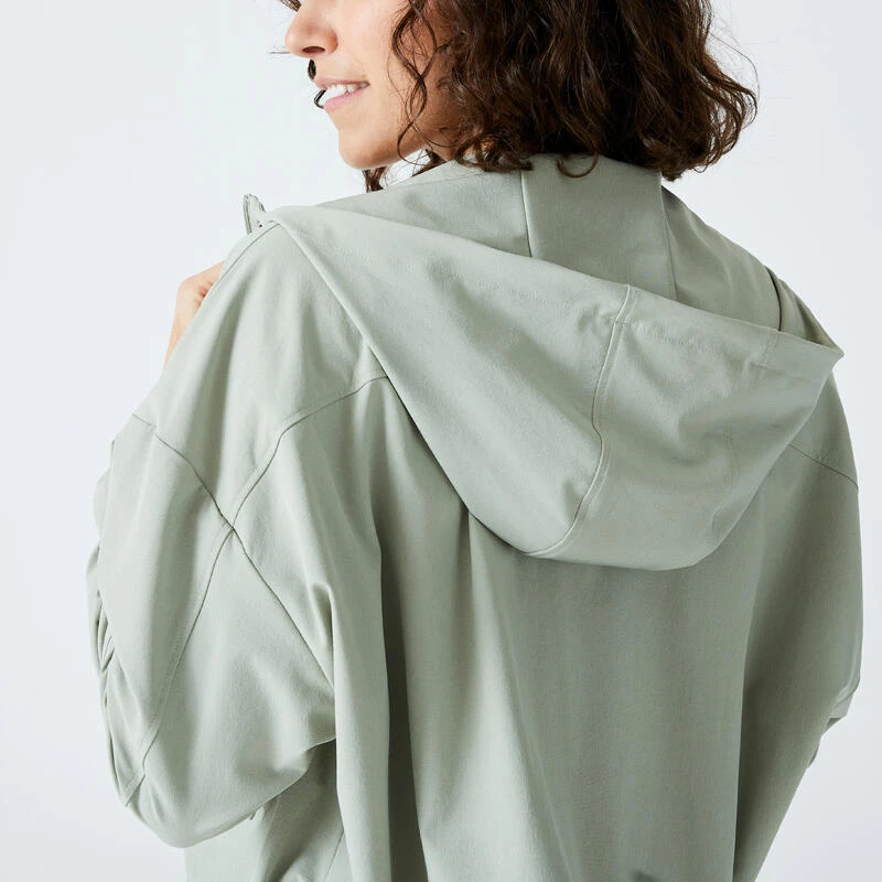 Compra en Decathlon Chaqueta Fitness Verde Amplia Capucha Una chaqueta con capucha muy ligera con un corte holgado y corto, para usar antes o después de la práctica, o incluso todos los días.