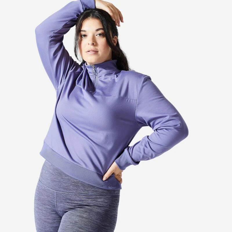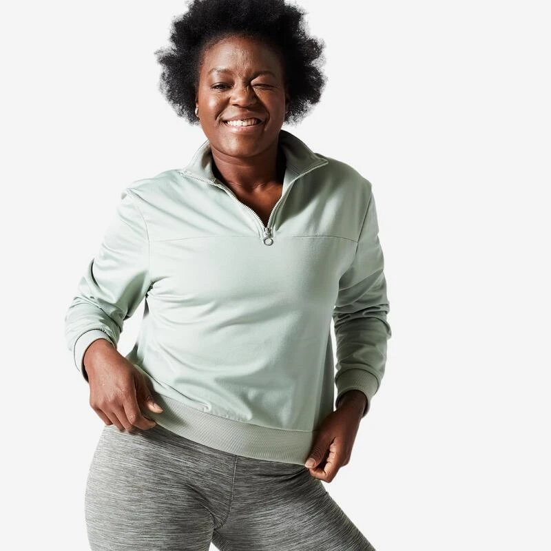 Compra en Decathlon Sudadera Fitness media cremallera corta Mujer Domyos 120 Una sudadera sencilla y cómoda, que se lleva a diario y es ideal para todos los tipos de prácticas deportivas.